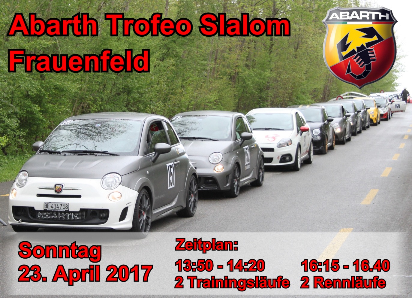 Am Sonntag 23. April 2017 findet der zweite Slalom der diesjährigen Meisterschaft in Frauenfeld statt. Kommen Sie doch am Sonntag vorbei und besuchen Sie das Abarth-Team. Neben dem Austausch mit anderen Abarthfanatikern, kannst Du dich von unserem Catering im Abarth-Zelt verwöhnen lassen.