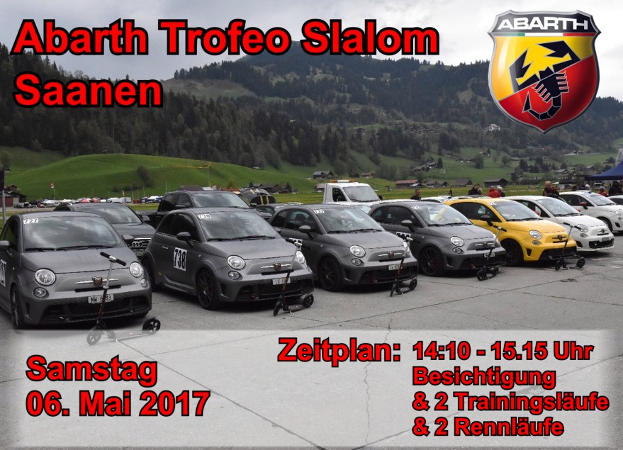 Am Samstag 06. Mai 2017 findet der dritte Slalom der diesjährigen Meisterschaft in Saanen statt. Kommen Sie doch am Samstag vorbei und besuchen Sie das Abarth-Team. Neben dem Austausch mit anderen Abarthfanatikern, kannst Du dich von unserem Catering im Abarth-Zelt verwöhnen lassen.