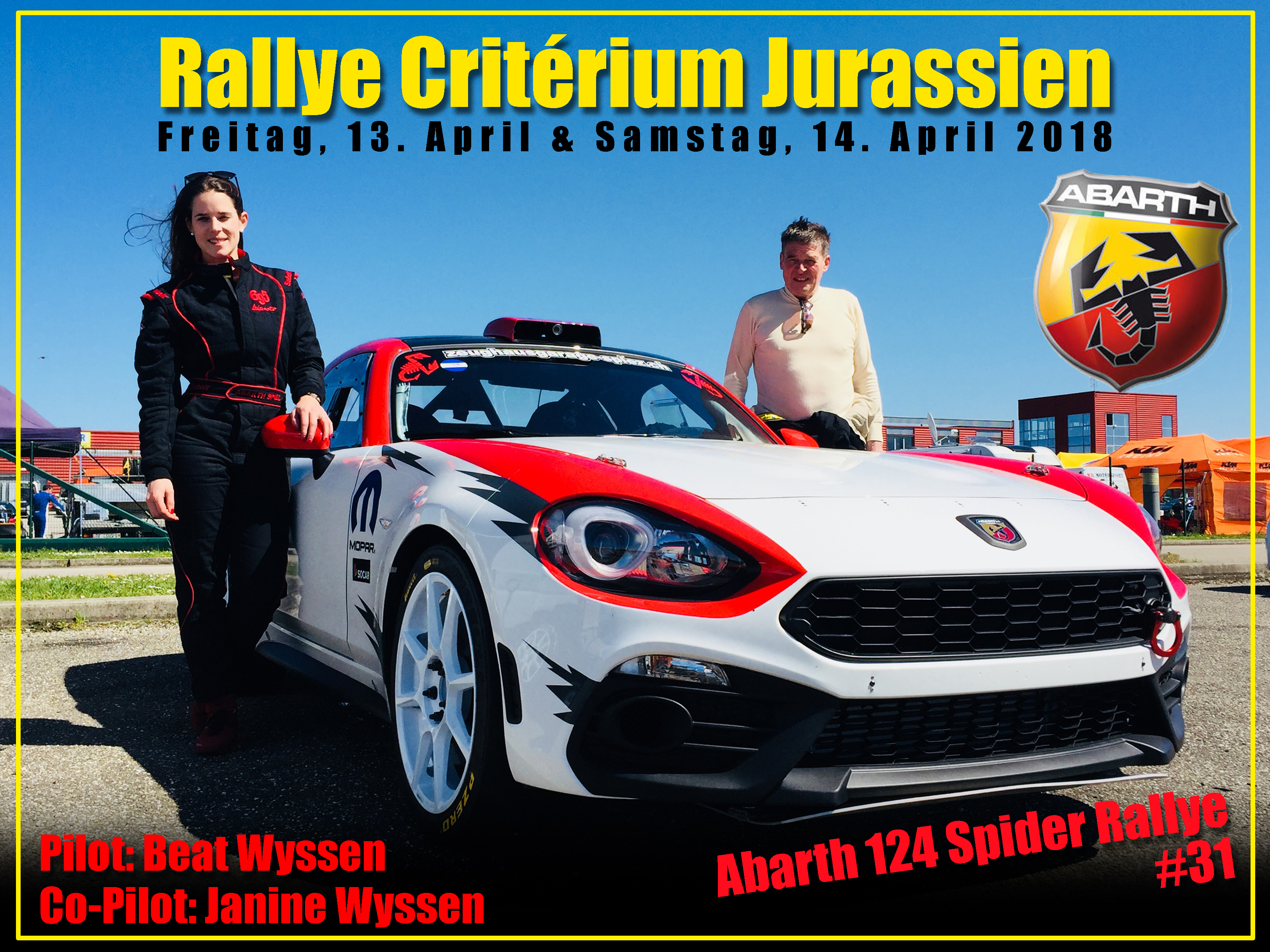 Vom Freitag 13. April bis Samstag 14. April 2018 findet das Rallye Critérium Jurassien statt. Am Start mit der Nummer 31 sind Beat und Janine Wyssen mit ihrem neuen Abarth 124 Spider Rallye.