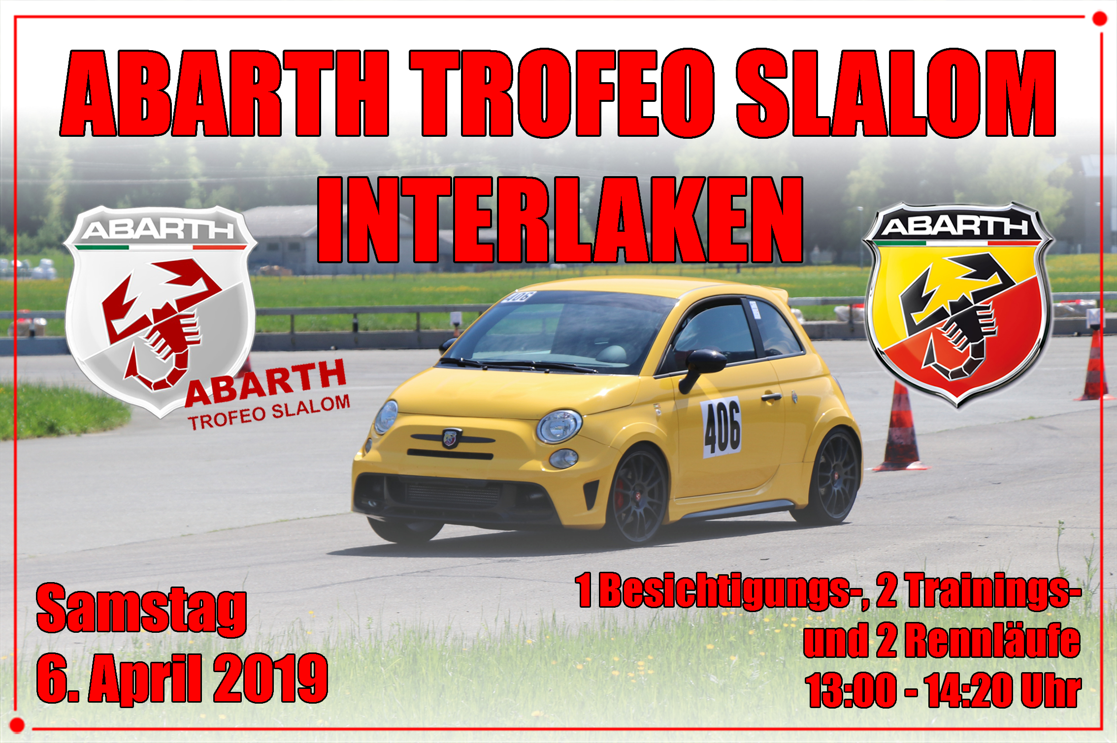 Am Samstag, den 6. April 2019 findet der erste Slalom der diesjährigen Meisterschaft in Interlaken statt. Komm doch am Samstag vorbei und besuche das Abarth-Team. Neben dem Austausch mit anderen Abarthfanatikern, kannst Du dich von unserem Catering im Abarth-Zelt verwöhnen lassen.